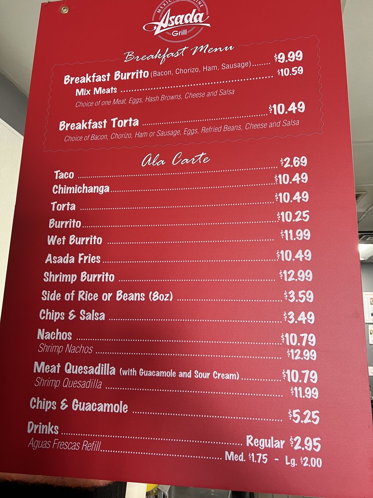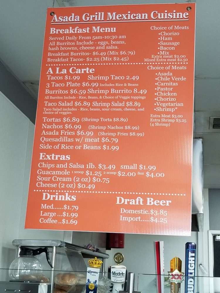 Asada Grill, a Mexican restaurant located in Bakersfield, CA, offers a variety of traditional dishes with a modern twist. Known for their flavorful tacos with options like Asada, Chile Verde, Carnitas, Pastor, and Chicken, customers rave about the generous portions and delicious seasoning. The burritos are also a crowd favorite, with options for Asada, Chicken, Chile Verde, Carnitas, Pastor, and even Shrimp. The attentive service and welcoming atmosphere make dining at Asada Grill a delightful experience. Customers praise the staff for their friendly manner and willingness to customize orders. With a diverse menu, including many vegetarian options, Asada Grill caters to a wide range of tastes. Don't miss out on the mouthwatering carnitas chimichanga and don't forget to try their signature salsas. Overall, Asada Grill is a hidden gem with affordable prices and unbeatable flavor.